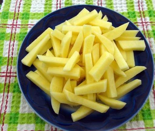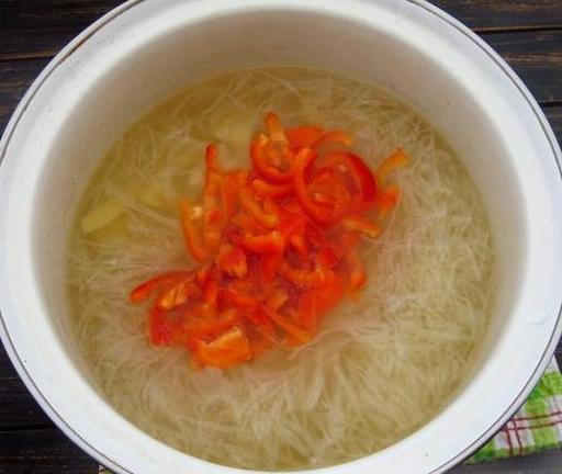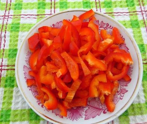 Очистіть болгарський перець від насіння та наріжте брусочками.