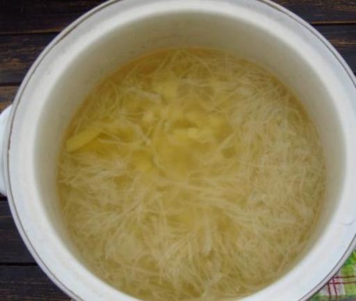 Бульйон доведіть до кипіння. Викладіть у бульйон картоплю. Варіть на невеликому вогні 7 хвилин.