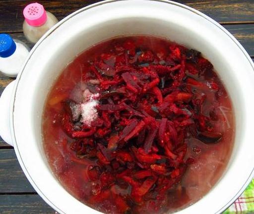 Додайте шматочки м'яса. Всипте чорний мелений перець та сіль. Доведіть до кипіння, зменшіть вогонь. Варіть борщ на слабкому вогні 5 хвилин.