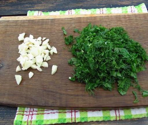 Дрібно наріжте кріп та петрушку. Очистіть та подрібніть часник ножем.