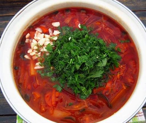Додайте зелень та часник у борщ. Доведіть до кипіння та зніміть каструлю з вогню.
