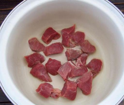 Наріжте яловичину шматочками та викладіть у каструлю.