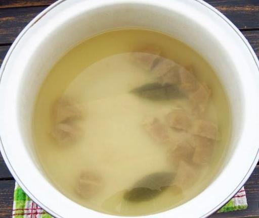 Залийте водою, доведіть до кипіння, зніміть піну. Варіть на слабкому вогні під кришкою близько години, до м'якості м'яса. За 10 хвилин до закінчення варіння додайте лавровий лист. Потім м'ясо вийміть, бульйон процідіть.
