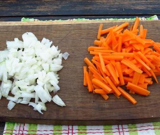 Очистіть цибулю та моркву. Цибулю наріжте кубиками, моркву – соломкою.