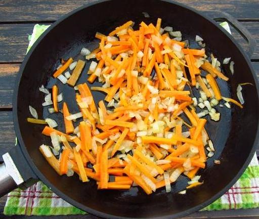 На сковороді розігрійте олію та викладіть цибулю з морквою. Обсмажуйте 5-7 хвилин на середньому вогні, до легкої золотистості.