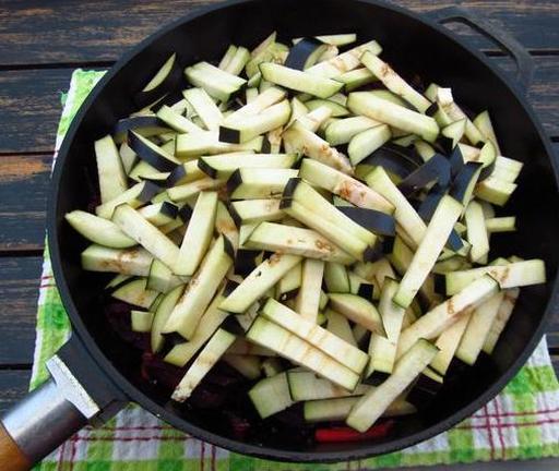 Наріжте баклажани невеликими брусочками та додайте в сковороду.
