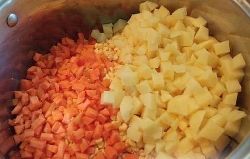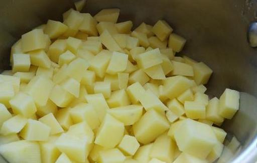 Очистіть та помийте картоплю. Наріжте кубиками зі стороною 1 см.