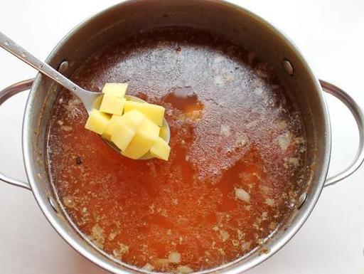 Очистіть картоплю, наріжте невеликими кубиками і додайте в каструлю із супом. Варіть гороховий суп на середньому вогні протягом 10-15 хвилин, до готовності картоплі.