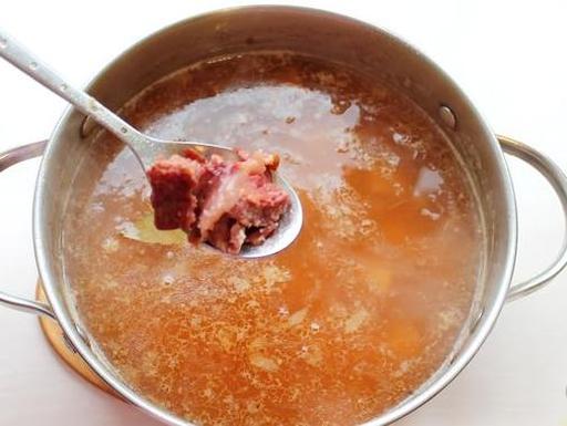 Викладіть у гороховий суп нарізане копчене м'ясо з ребер і перемішайте.