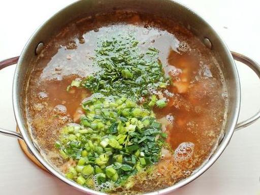 Наріжте кріп та зелену цибулю і додайте в каструлю із супом. Доведіть до кипіння та вимкніть вогонь. Гороховий суп з обсмаженою свининою та копченими реберцями готовий.