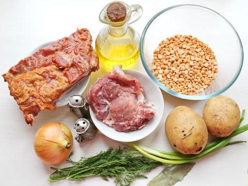 Цей гороховий суп готується з попередньо обсмаженими шматочками свинини, копченими реберцями та цибулею. Суп з м'ясом виходить неймовірно смачним та ароматним.