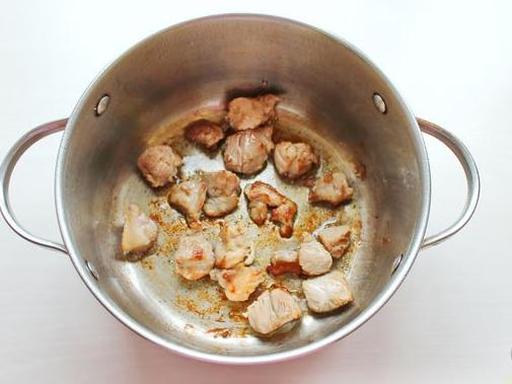 У каструлі з товстим дном розігрійте рослинну олію. Наріжте м'якоть свинини середніми шматочками. Викладіть у каструлю та обсмажте з усіх боків до золотистої скоринки, приблизно 5-6 хвилин.