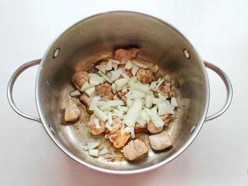 Очистіть ріпчасту цибулю, наріжте середніми кубиками і додайте в каструлю до обсмаженої свинини. Перемішуючи, обсмажуйте на середньому вогні протягом 7 хвилин.
