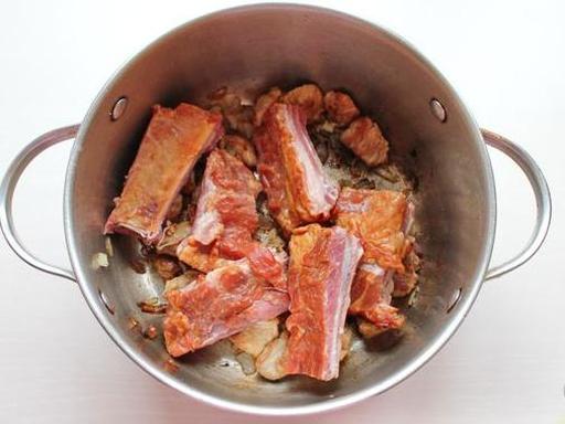 Наріжте копчені реберця шматочками і додайте в каструлю. Перемішайте та обсмажуйте ще 2 хвилини.