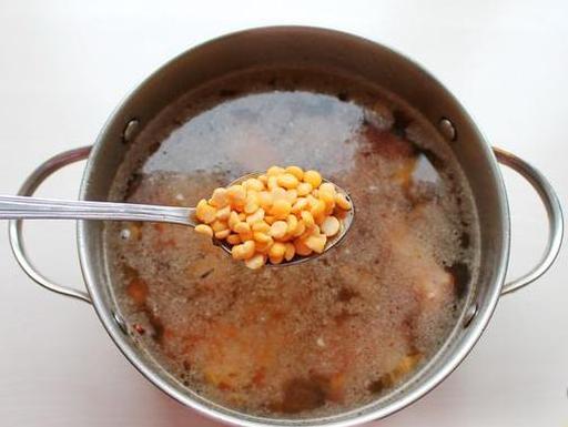 З набухлого гороху злийте воду, промийте його і додайте в каструлю. Варіть на повільному вогні 40-60 хвилин, до готовності гороху.