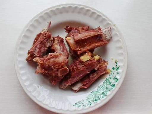 Вийміть копчені ребра із супу, остудіть, зніміть м'ясо з кістки та наріжте шматочками.