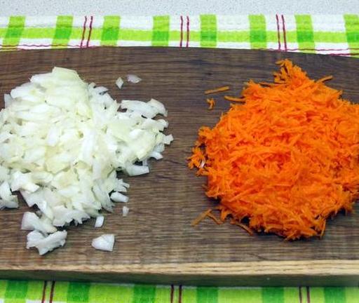 Очистіть цибулю та моркву. Цибулю наріжте кубиками, моркву натріть на середній тертці.
