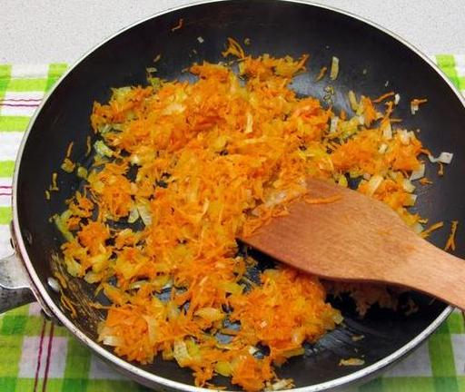 На сковороді розігрійте олію та обсмажуйте моркву з цибулею близько 5 хвилин, до легкої золотистості.
