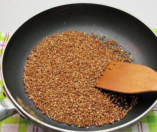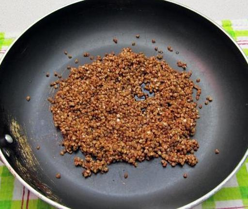 Гречану крупу ретельно промийте та злийте воду. Розігрійте суху сковороду та викладіть на неї гречку.