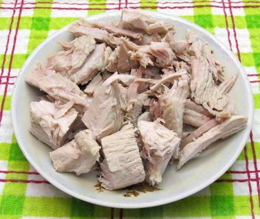 Готове м'ясо вийміть з бульйону, відділіть від кістки та наріжте середніми шматочками. Накрийте м'ясо на тарілці плівкою та відставте, а бульйон процідіть.