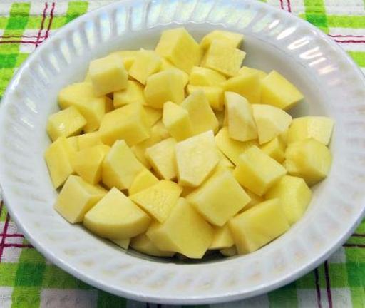 Очистіть картоплю та наріжте середніми кубиками.