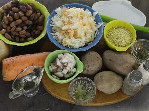 Підготуйте всі інгредієнти. Селеру можна виключити, якщо не любите. Замість води використовуйте м'ясний бульйон за бажанням. Якщо квашена капуста занадто кисла, промийте її холодною водою та відіжміть. Бекон наріжте дрібними кубиками.