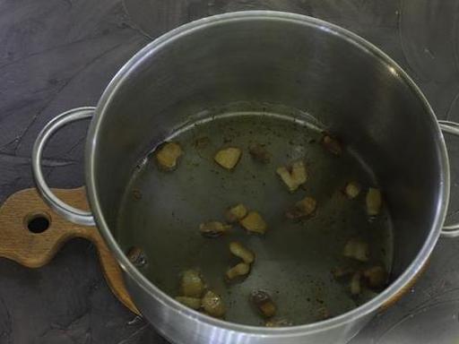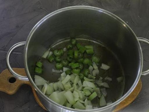 Перекладіть обсмажений бекон в окрему тарілку. Очистіть цибулю і наріжте кубиками. Стебло селери наріжте шматочками. Відправте цибулю та селеру в каструлю, де обсмажувався бекон. Готуйте на невеликому вогні 4-5 хвилин, помішуючи, до м'якості овочів.