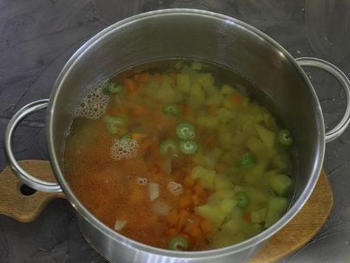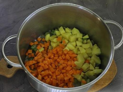 Очистіть картоплю та моркву. Моркву наріжте невеликими кубиками або кружечками, картоплю наріжте середніми шматочками. Додайте овочі в каструлю.