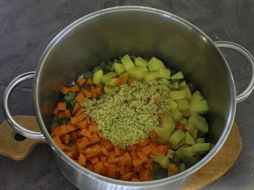 Ретельно промийте пшоно кілька разів під проточною водою. Якщо є побоювання, що пшоно гірчить, залийте його окропом на 5 хвилин, потім промийте. Додайте пшоно до решти інгредієнтів.