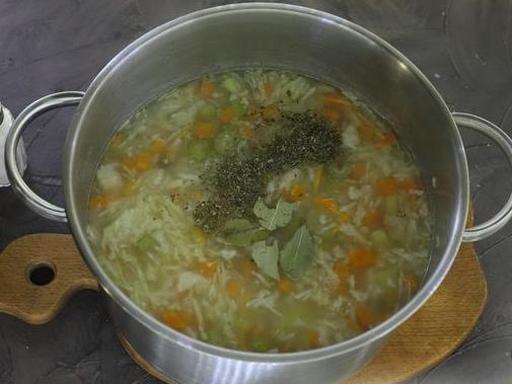 Додайте італійські трави та лавровий лист. Посоліть і поперчіть за смаком. Прокип'ятіть 1-2 хвилини і вимкніть вогонь.