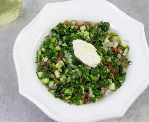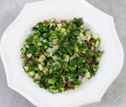 Наріжте огірки та охолоджену печену цибулю невеликими кубиками. Всі компоненти страви готові — можна сервірувати!