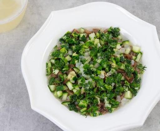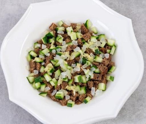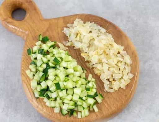 Додайте 1-2 столові ложки нарізаного огірка та трохи нарізаної печеної цибулі (за смаком).