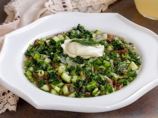 Освіжаюча тюря на світлому квасі з темним хлібом, овочами та зеленню — ідеальна страва для спекотних літніх днів! Цей холодний хлібний суп нагадує окрошку, але готується простіше і містить менше компонентів. Основа з бородинського хліба забезпечує страві ситність, поєднання огірка, печеної цибулі, часнику та зелені надає особливого смаку, а холодний квас приємно освіжає. Скуштуйте!