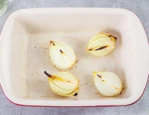 Очистіть ріпчасту цибулю та розріжте навпіл. Змастіть половинки цибулин олією та викладіть на деко або у форму для запікання зрізом догори. Відправте форму в розігріту духовку та запікайте цибулю при температурі 180 градусів 15-17 хвилин, до м'якості. Потім вийміть цибулю на тарілку та остудіть. (Для економії часу цибулю можна запекти заздалегідь.)