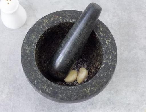 Очистіть часник, посипте 1 щіпкою солі та розімніть до пастоподібного стану в ступці за допомогою товкача. Або можна дрібно нарізати часник і розтерти, притискаючи до обробної дошки плоскою стороною ножа.