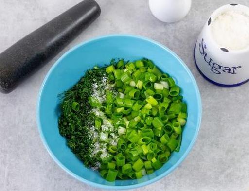 Дрібно наріжте зелену цибулю та кріп. Додайте до нарізаної зелені цукор та 1 щіпку солі. Перемішайте та розімніть товкачем або ложкою, доки зелень не пустить сік і не стане м'якшою та ароматнішою.