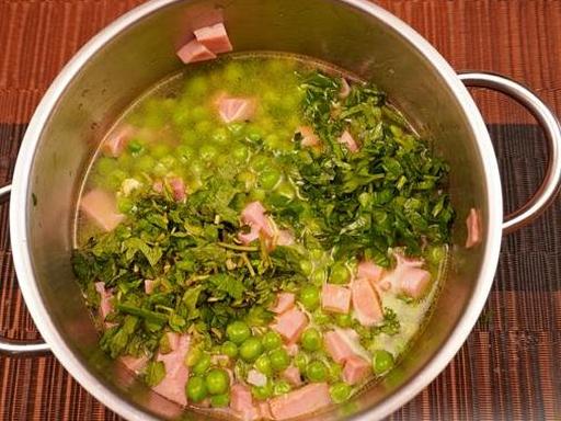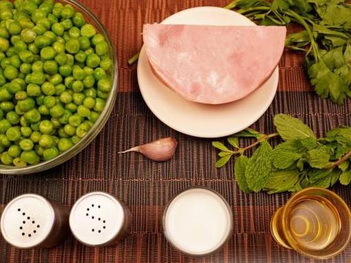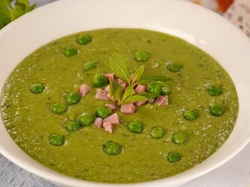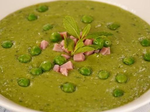 Цей ароматний і поживний крем-суп готується з обсмаженого горошку та шинки, які потім пюруються та доповнюються вершками. Додавання м'яти надає супу свіжості та вишуканого смаку.