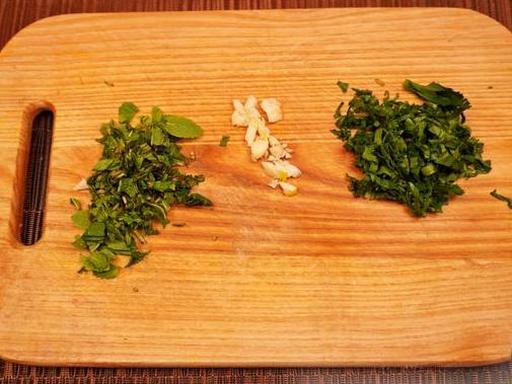 Дрібно наріжте листя м'яти та петрушки. Очистіть і дрібно наріжте часник.