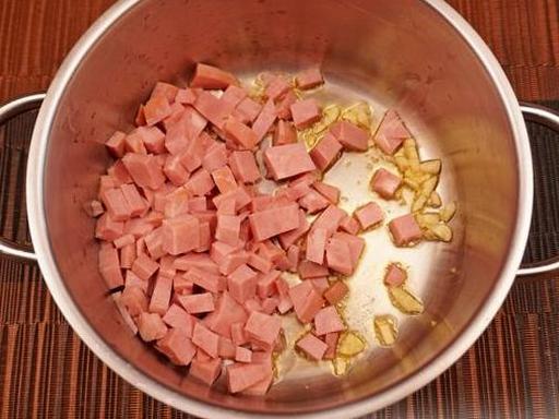 Додайте шинку в каструлю та обсмажуйте 3-4 хвилини.