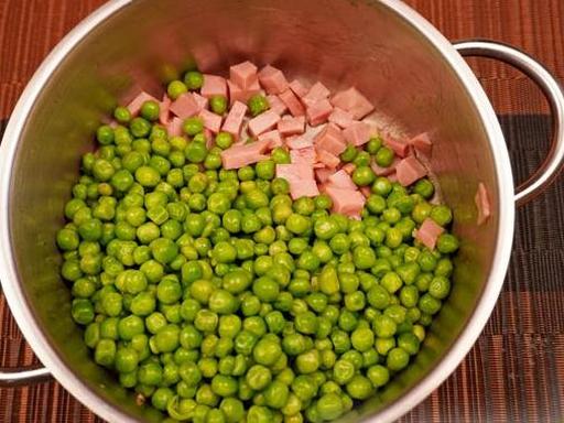 Додайте горошок і обсмажуйте 2 хвилини.