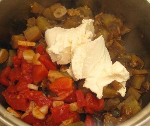 З'єднайте обсмажені помідори та баклажани. Додайте крем-сир.