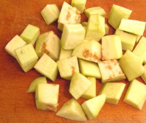 Для приготування крем-супу з баклажанів з томатами: вимийте баклажани, очистіть від шкірки і наріжте кубиками.