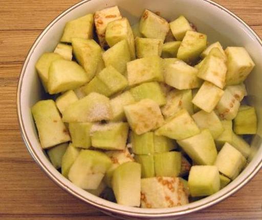 Посоліть баклажани і залиште на 3-4 години для видалення гіркоти. Цей крок можна пропустити при використанні не гірких сортів.