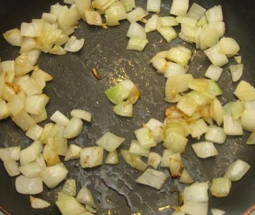 Розігрійте 1 столову ложку оливкової олії на сковороді. Обсмажуйте цибулю на середньому вогні, помішуючи, до золотистого кольору (5-7 хвилин).