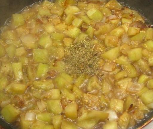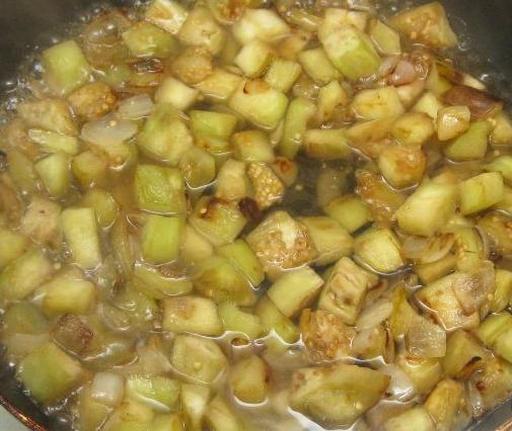 Додайте баклажани та ще 1-2 столові ложки оливкової олії. Тушкуйте баклажани, помішуючи, 10 хвилин. Потім влийте гарячу воду або овочевий бульйон. Накрийте кришкою і тушкуйте 5 хвилин.