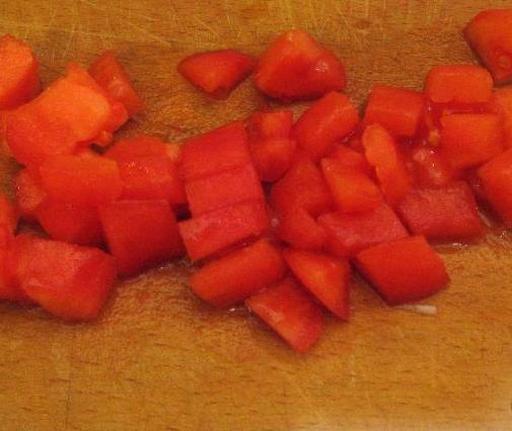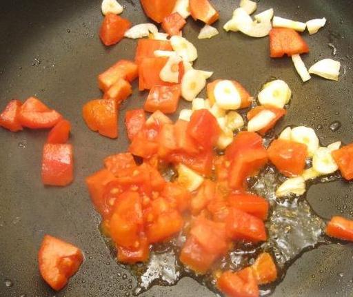 На сковороді розігрійте 1 столову ложку оливкової олії. Обсмажуйте часник і помідори на середньому вогні, помішуючи, до м'якості (5-7 хвилин).