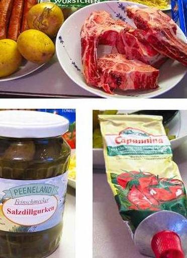 Насамперед поставте варитися бульйон. Очистіть дві картоплини, які будуть додані в кінці варіння. Після вилучення м'яса, картоплю розімніть міксером, щоб загустити бульйон. Відокремте м'ясо від кісток і поверніть його в бульйон. Частину бульйону збережіть для подальшого використання, а рештою розбавте Айнтопф до бажаної густоти. З мого досвіду, Айнтопф набагато смачніший, якщо його розбавляти бульйоном, а не водою.