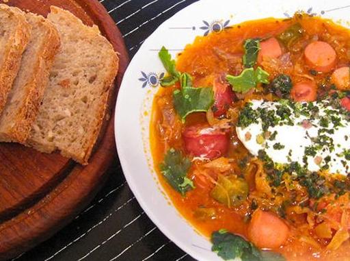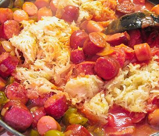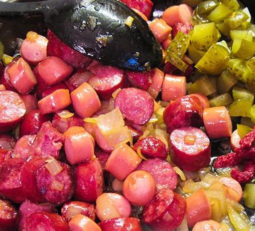 Далі готуйте за рецептом: наріжте ковбасу на шматочки середнього розміру (на ваш розсуд). Налийте трохи олії в каструлю або глибоку сковороду (смаження на топленому маслі надасть страві чудового аромату) і спочатку обсмажте ковбасу, потім додайте сосиски. Поки обсмажується, очистіть та наріжте цибулю, яку додайте до ковбаси та сосисок. Перемішайте та обсмажуйте все на невеликому вогні. Наріжте огірки. Як тільки ковбаски та сосиски набудуть гарного кольору, а цибуля стане прозорою та бурштиновою, додайте огірки та концентровану томатну пасту.