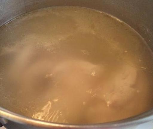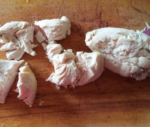 Промийте куряче філе, помістіть у каструлю і залийте холодною водою. Доведіть до кипіння, регулярно видаляючи піну. Зменшіть вогонь до мінімального, посоліть і варіть курку під кришкою до готовності, приблизно 40 хвилин.