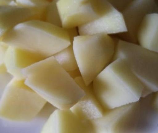 Тим часом очистіть, вимийте і наріжте картоплю кубиками.